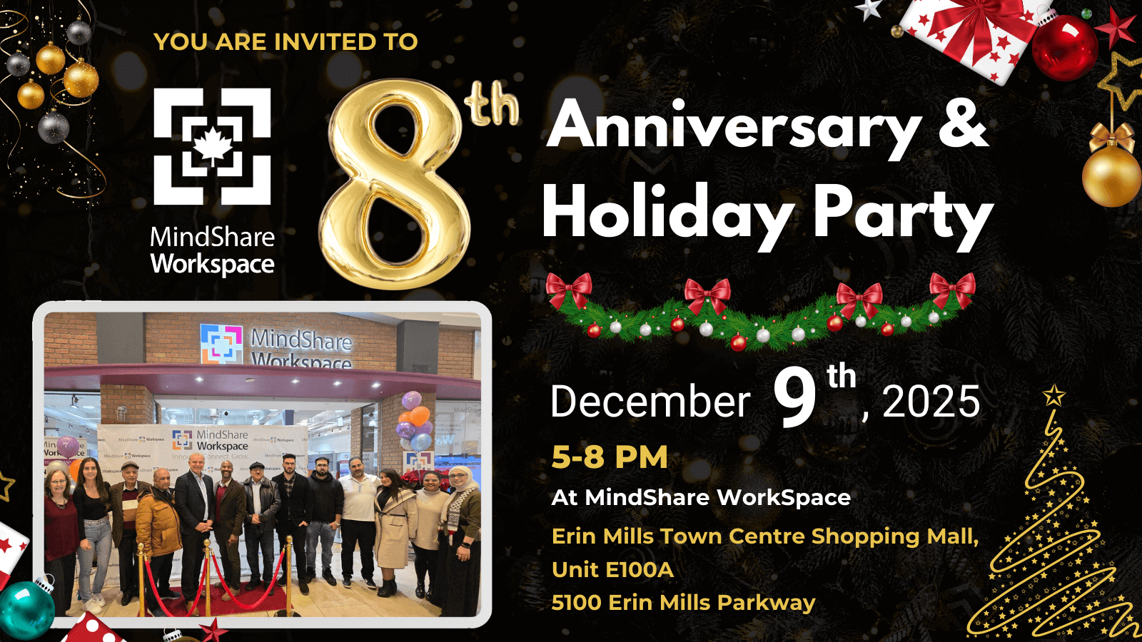 We’re less than two weeks away from the MindShare Workspace 8th Anniversary, EdTech Canada Holiday Party , a special moment to gather, reconnect, and celebrate the incredible community that has shaped Canada’s first coworking space in a shopping mall.
